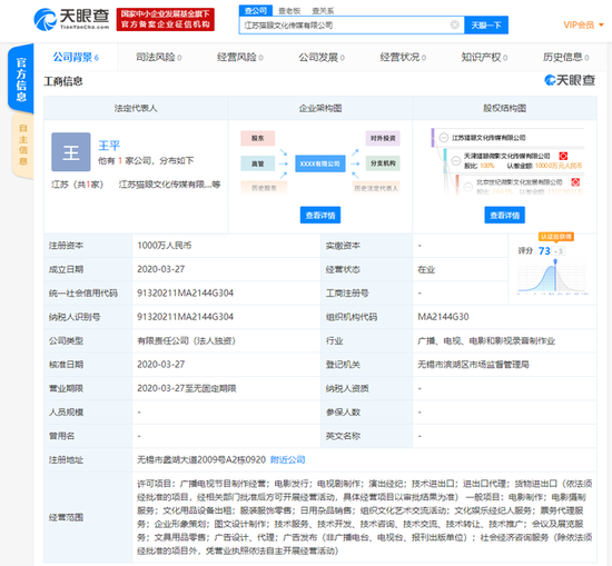 公开数据显示,江苏猫眼文化传媒有限公司注册资本1000万元人民币,法定代表人为该公司执行董事王平,公司经营范围包括广播电视节目制作经营;电影发行;电视剧制作;演出经纪;技术进出口等。