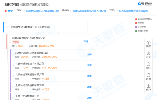 天眼查股东信息显示,该公司由天津猫眼微影文化传媒有限公司全资持股。