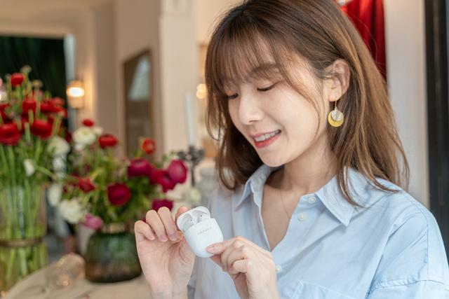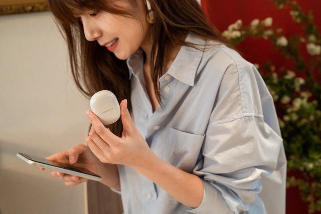 打开电池仓,两个使用人体工学设计的半入耳式耳机在其中,圆润外形与电池仓相得益彰。单只耳机重量4.1g,佩戴在耳机上感觉异物感很弱,可以保证长时间佩戴。