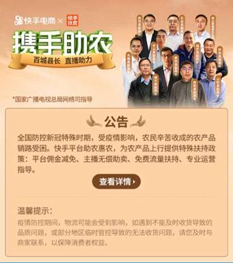 近期,以快手为代表的多个直播平台相继开启了“战疫助农”县长直播系列活动,不少的地方书记、县长走进直播间,销售家乡的优质农产品。在3月初的快手“携手助农”活动中, 11位县长、县领导连同11位快手达人进行6天的直播带货活动,共吸引了超过2100万人观看。活动累计销售数百吨果蔬生鲜产品,同步销售了泡椒、蜂蜜、咸鸭蛋、糍粑等超过20多种因疫情而滞销的农副产品,带动各地个体农户销售近百万单鲜农产,累计销售额突破2000多万元。