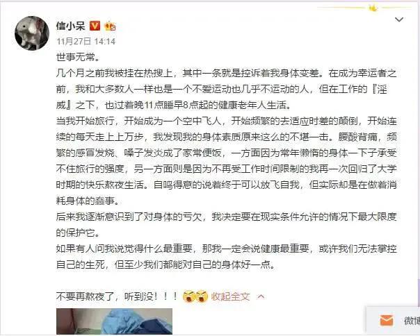 后来信小呆开启了自己的全球之旅,拿着支付宝奖励的旅游机票、车票开始周游世界,看上去就像很多人说的——达到人生巅峰。然而实际生活却不是这样,信小呆后来就透露过,为了尽快用完支付宝的奖励,她经常为了旅游熬夜、倒时差,还刷爆过自己的信用卡。本来自鸣得意的以为能“放飞自我”,结果却发现在做着消耗自己身体的蠢事,她表示说自己的身体越来越差了。