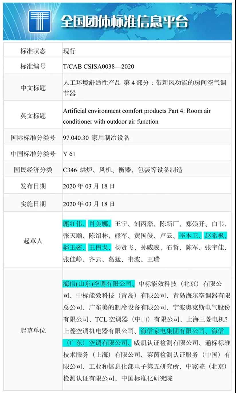 据悉,该标准由海信空调公司副总裁鹿红伟等6位工程师作为起草人牵头制定,而海信也是中国第一台新风空调制造者。海信制冷系统研发部总经理的李本卫表示:“事实上我们从2006年就开始做新风空调的研发,但在那个阶段这样的产品有些太超前了。消费者对空调的诉求还集中在制冷制热的基本功能上,相当于还处于‘温饱阶段’,我们对消费需求预估不足,上市后业绩不是很好。”