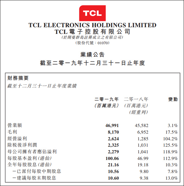 (文/观察者网 一鸣)3月29日,TCL电子(01070.HK)披露2019年财报显示,其全年实现营业额469.9亿港元,同比增长3.1%;归母净利润22.8亿港元,同比增长118.9%;全年电视机销售量3200万台,同比增长11.9%。