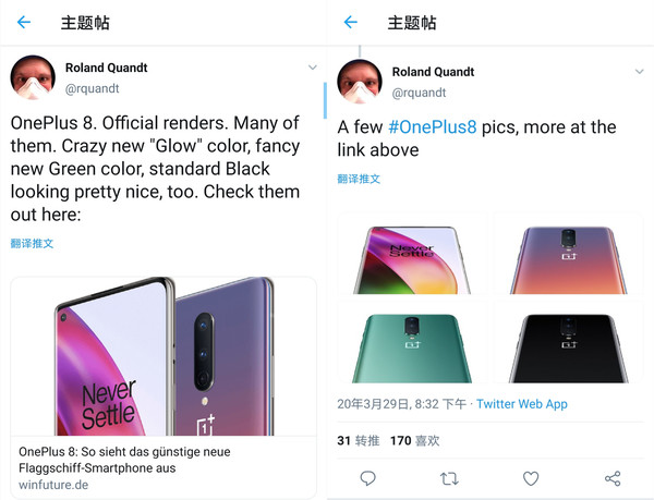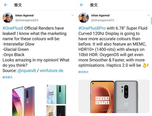3月30日,一加科技2020年的旗舰机一加8系列将在下个月发布,目前网上流传着很多关于这款手机的配置信息。日前,外国博主@Roland Quandt 和@Ishan Agarwal 都曝光了这款手机的配色信息。