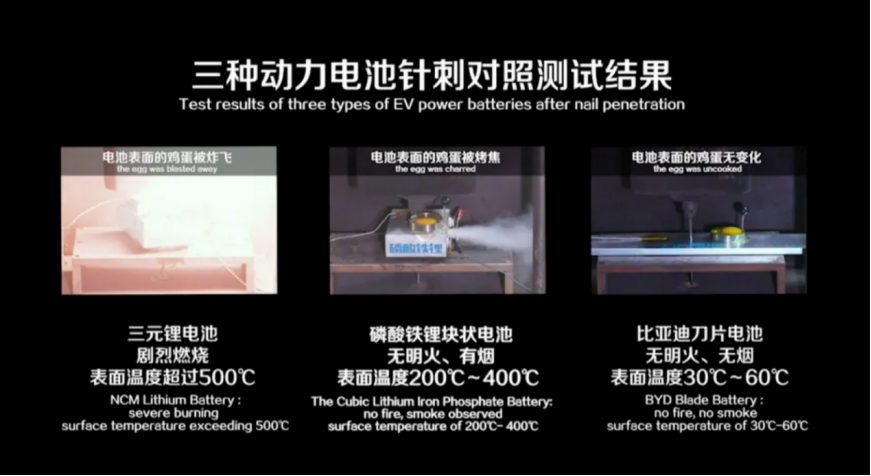 无独有偶。前一日,比亚迪也正式对外发布新一代“刀片电池”,比亚迪董事长王传福更是在发布会上放出豪言壮语:“刀片电池将重新定义新能源汽车的安全标准”、“要将‘自燃’从电动汽车的字典里抹去!”