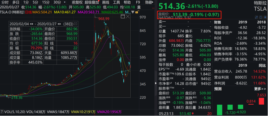从资本市场来看,此前引起华尔街疯狂的特斯拉股价近期也有所降温。数据显示,从2月4日至今,特斯拉股价已经从968美元高位一路下跌至目前514美元,跌幅超34%。截至3月30日下午18点左右,美股盘前,特斯拉股价依然微跌0.19%。