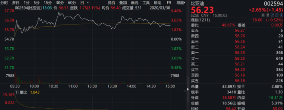 3月30日,在市场普遍低迷的背景下,比亚迪AH股盘中分别逆势涨超5%和4%。