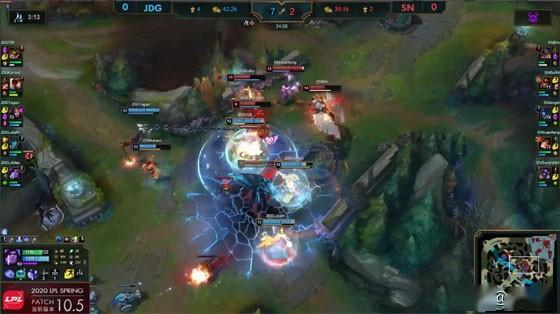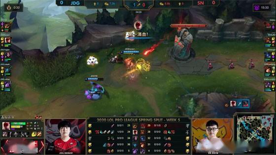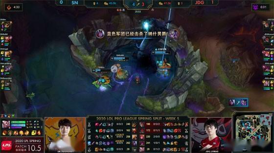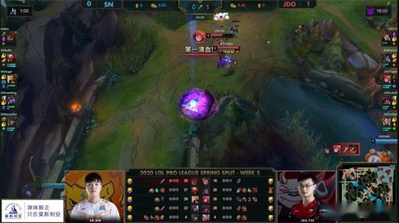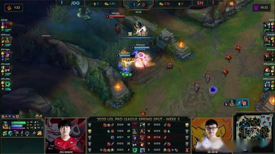 前期SN上中野针对鳄鱼的第一波节奏被妖姬传送劝退化解,丽桑卓传送落地只得回线。10分钟两队先后在峡谷先锋河道集结,盲僧抢到峡谷先锋,塔里克的大招成功规避了SN的第一波爆发伤害,JDG打出0换5团灭SN,利用先锋撞平上路一血塔。随后反了SN蓝buff的盲僧被牛头开到,剑魔将其终结。牛头在上方河道排视野时被妖姬打出大招,皇子后撤途中被盲僧大招踢回,JDG集火击杀皇子,控下先锋放在中路撞低了SN一塔血量。