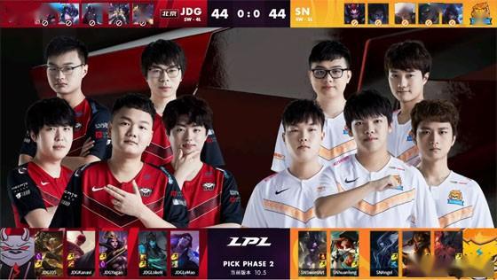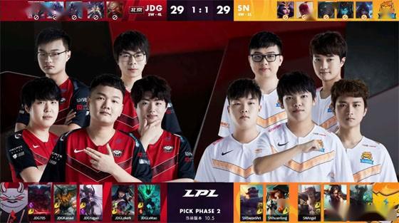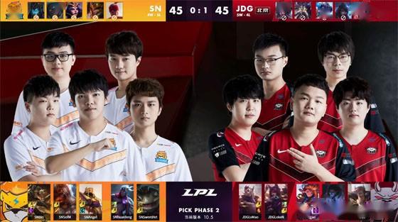 中期SN放弃风龙,同时妖姬打残SN下路组血量,JDG推掉中路一塔,经济领先3千。24分钟牛头在大龙河道开塔里克,卡莉丝塔大招将其收回,盲僧R闪踢回丽桑卓,塔里克大招化解了SN的第一波伤害,虽然皇子框住JDG多人,但SN后续伤害不足,JDG团灭SN稳稳将大龙收入囊中,SN全部外塔和中路水晶失守,经济落后9千,装备与JDG相差甚远。JDG抱团继续推进中路,丽桑卓被集火秒杀,SN三人倒地无力回天,JDG一波结束比赛,1-0暂时领先。