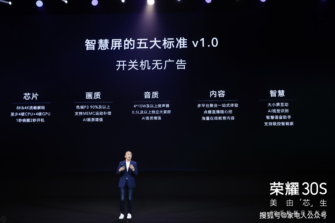 3月30日,荣耀线上举行荣耀30S手机“美由‘芯’生”新品发布会。发布会上,荣耀总裁赵明强调了以荣耀智慧屏为代表的智慧全场景优异战绩,并重申了荣耀智慧屏作为家庭中心的重要地位。同时,针对大屏行业长期存在的产品标准不清晰的问题,以及消费者选购大屏的困惑,赵明从芯片、画质、音质、内容和智慧定义大屏产品五大标准,旨在为大屏行业的设计和发展指明方向,以此带动行业和产业的标准化。