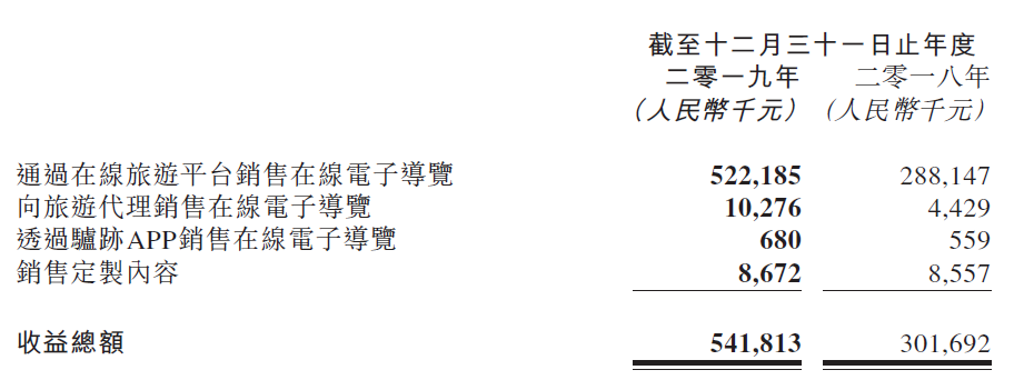 据财报披露,2019年,驴迹科技与27个在线旅游平台建立合作(2018年为22个),并与其中两个平台订立了独家合作协议,公司通过在线旅游平台销售在线电子导览的收益增加约81.2%至5.2亿元,占总收入的95.9%,占比相比上年(95.5%)略有提高。
