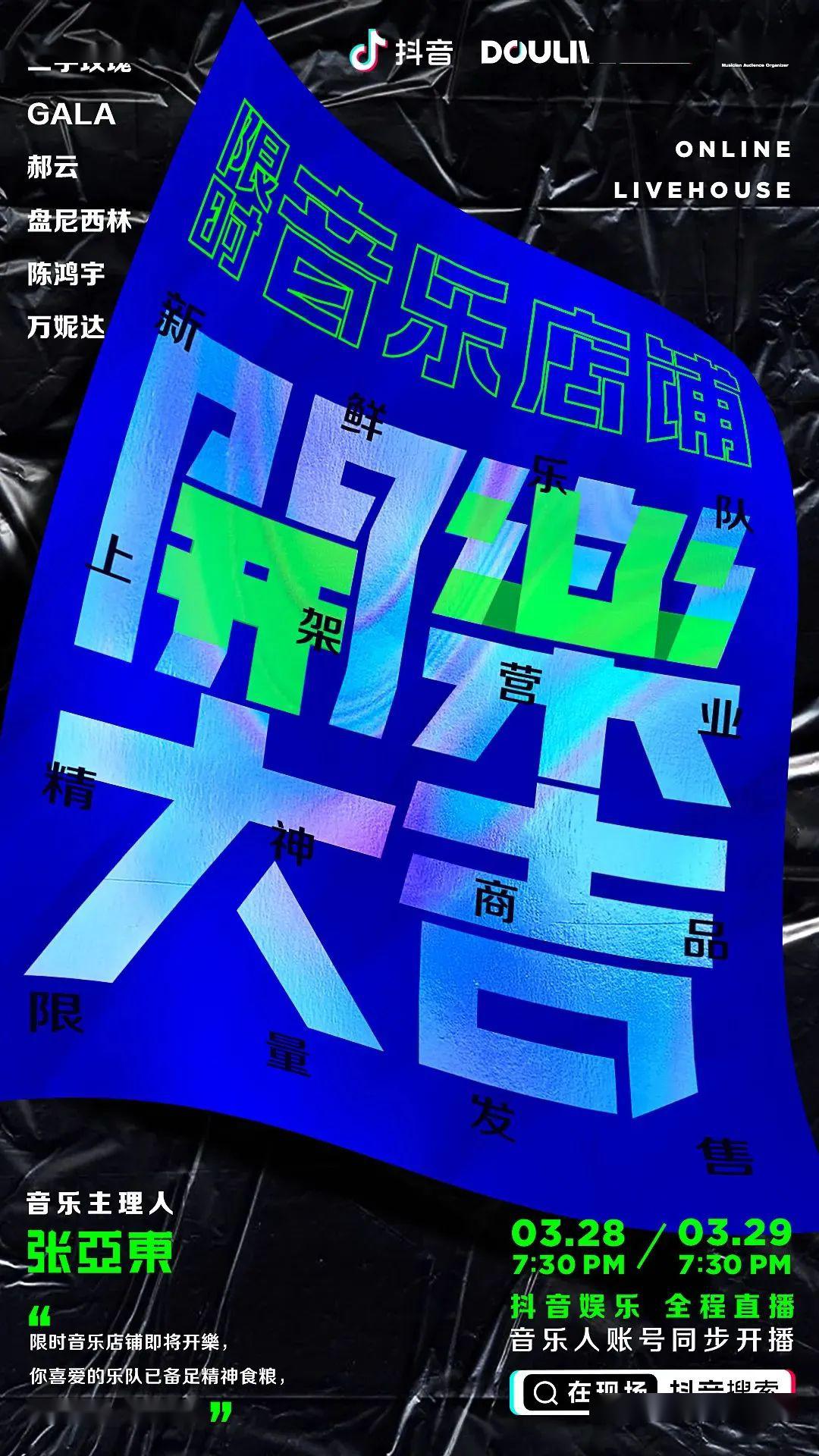 3月10日,抖音娱乐直播厂牌DOULive正式上线,近日,厂牌Live专场“DOULive在现场”携手MAO livehouse开设“限时音乐店铺”。