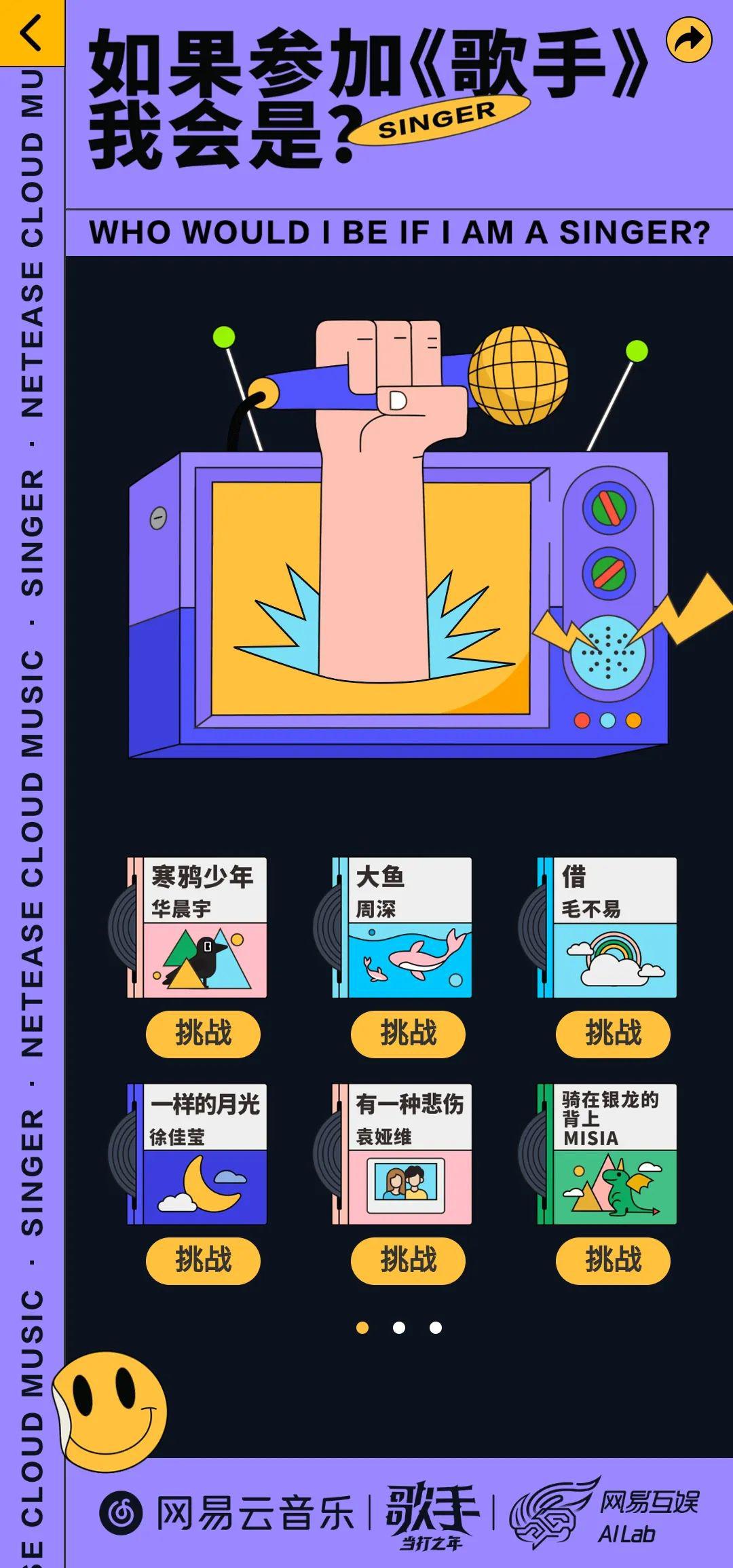上周五,湖南卫视《歌手·当打之年》播出了第八期节目。作为节目独家音频平台,网易云音乐联合节目与网易互娱AI Lab,推出了名为“来到歌手,我会是__?”的H5页面。