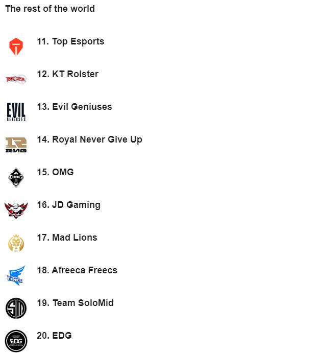 第11-20名的排名如下图所示,LPL战队中有TES排在第11位,RNG排在第14位,OMG排在第155位,JDG排在第16位,以及EDG排在第20位。总的来看前20名中LPL战队占了8位,名次还是比较靠前的。