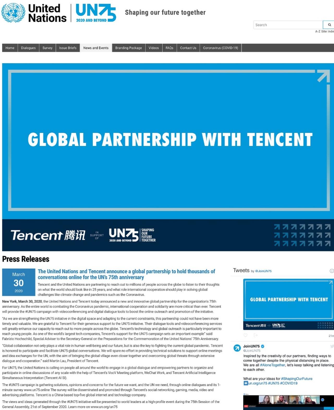 鞭牛士 3月31日消息,近日,联合国在纽约总部宣布,腾讯公司成为其全球合作伙伴,为联合国成立75周年提供全面技术方案,并将通过腾讯会议、企业微信和腾讯同传在线举办数千场会议活动。这意味着,在新冠病毒疫情之下,迄今为止规模最大的全球对话将在中国互联网科技企业的技术支持下进行。联合国发布官方新闻称,“这是一项全新且创新的全球合作”。