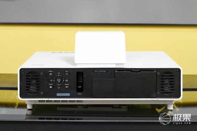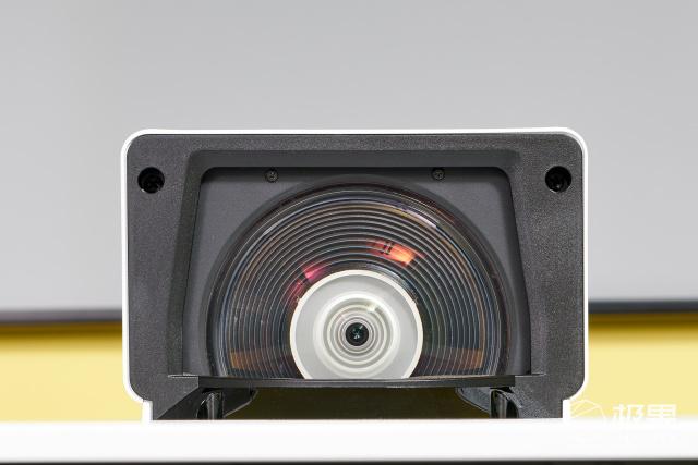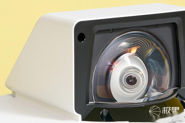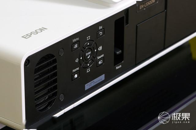 产品上方靠后的位置有一大块凸起,千万别觉得它不协调,因为这里是爱普生智能激光电视EH-LS500最重要的部分之一:富士能(Fujinon)专业影像镜头。不要小看这个镜头,它包含了专为4K投影制作的16片球形镜片+3片非球面镜片,投影100吋、120吋的最短投影距离只需大约60-70cm。
