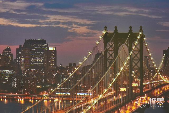 这种大型景观画面,对电视机细节处理能力要求向来比较高。为了看得更清楚,我将图片放大,甚至看到它出现了颗粒。在这种状态下,桥上的灯泡依旧非常清晰,远处建筑的暗光部分也没有出现明显的涂抹痕迹。