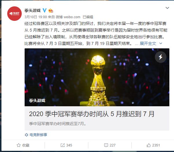 疫情直接造成各个赛区的主办方被迫延后所有春季赛事,洲际对抗赛直接取消,年中举办的MSI季中冠军赛也因此延后到7月份。