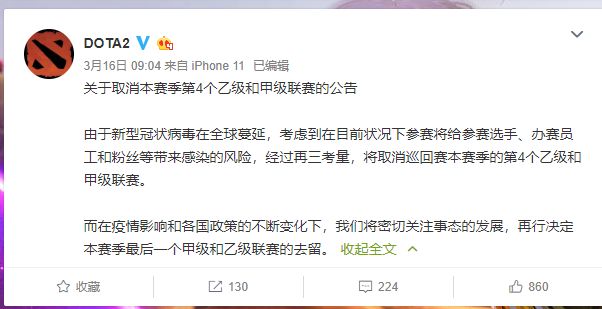 3月份举办的ESL one赛事限期,V社雷厉风行直接取消了第四个Major与Miner赛事。V社目前并未公布后续的处理措施,但玩家和选手们都关注Ti国际邀请赛是否会受到影响。