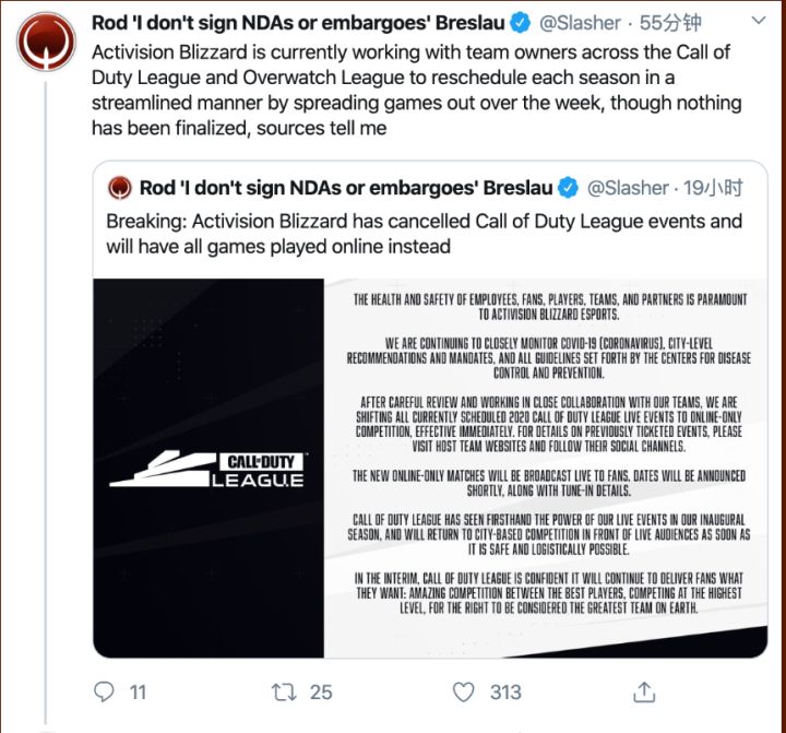 更为糟糕的事,因为OWL的成功暴雪开始在自家的游戏上复制这种模式,《使命召唤 OL》的新赛季首当其冲,它们预计从2020年开始推行主场化。因为疫情,一月份已经在明尼苏达线下开打的比赛被暴雪叫停随后全部转移到了线上,接下来《使命召唤OL》的电竞赛事也会面临和OWL一样的尴尬。