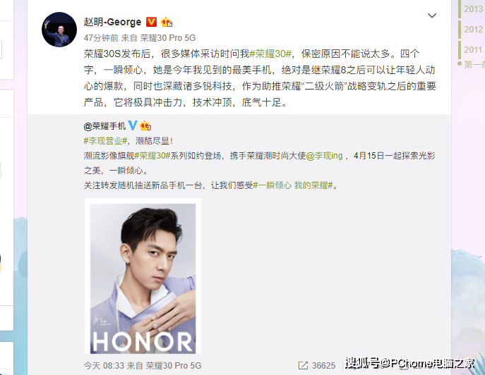 【PChome手机频道资讯报道】一波新品刚刚发布,下一波新品又来了。刚刚,荣耀手机官方微博官宣荣耀30系列将于4月15日正式发布,据悉该系列新品仍将由荣耀潮时尚大使李现代言。同时在微博海报中,李现手持荣耀30系列手机,并配文“潮流影像旗舰#荣耀30#系列如约登场”意在宣传这款手机的强悍影像实力与高颜值。