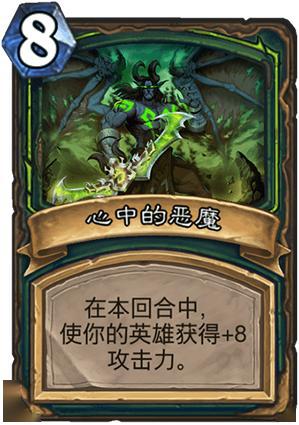 心中的恶魔 2分这卡就像是一个炎爆,虽然能够造成巨大的伤害,但是单位水晶的效率较低。某些组合技型的卡组还是会考虑带它的,因为光有恶魔变形的直伤可能还不大够。总之,这卡并没有看上去那么不堪。