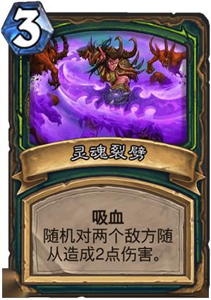 灵魂裂劈 1分回4血的顺劈斩。本身2费的顺劈斩根本就没人会带,而这个灵魂顺劈比顺劈斩多了一费,换来了额外4血的回复效果,看上去好像还是不怎么样。如果你想要某种低费群解法术,那刃舞可比它强多了;而如果你看中的是解场+回血,那么奥达奇战刃也会是更好的选择。
