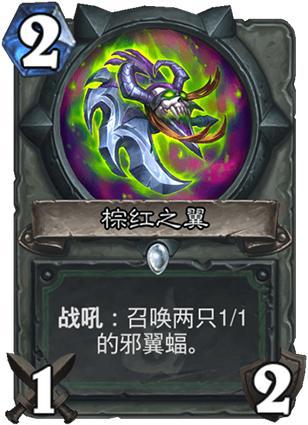 棕红之翼 4分2费作战动员。我们觉得这张卡很不错,它提供了游戏中最强的2费展开手段之一。如果恶魔猎手早早摸到棕红之翼,你就很难在场面上压住他。因为棕红之翼与恶魔猎手的其他各种解场手段完美契合,可说是攻守一体。各种路线的恶魔猎手都会愿意考虑携带它的。