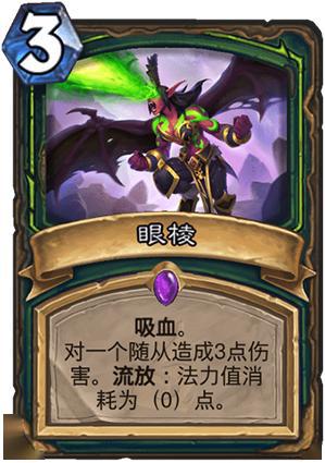 眼棱 3分总算来了张像样的流放卡。在流放条件下无需费用即可打出,这一点大大提高了该卡的可用性。我们可以通过调整手牌,从而在当前回合打出0费眼棱,这就不像邪刃武士还要花费高额水晶,甚至只能祈祷靠右手第一张来触发。不过就算必须要花3费才能打出,眼棱其实也不算弱。毕竟它的伤害已经足以击杀多数费用相近的随从了。总之我们觉得眼棱的强度堪比盗贼的宿敌。