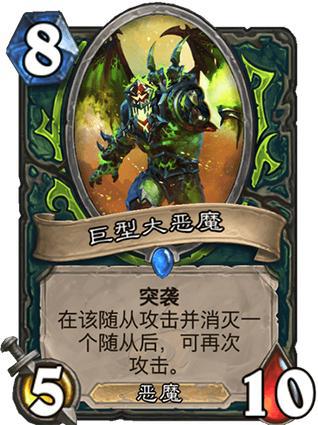 巨型大恶魔 2分值得配合暴怒邪吼者或是邪能召唤师的高费恶魔之一。这卡略优于莽头食人魔,可以被当做一张伪AOE来使用。虽然谈不上特别强力,但如果真的有“慢速恶魔瞎”的话,那这卡也还算能用。