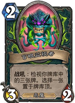 盲眼监视者 2分带有微弱正面特效的2费随从。一定程度上可以帮助平滑曲线,同时提高流放卡的稳定性。但其实这个“观星”特效并没有很强,甚至可以说是一个陷阱,因为实际上“观星”远远比不上实实在在的过牌。除了一些特别注重前期铺场的卡组之外,其他恶魔猎手应该都不会对它有兴趣的。
