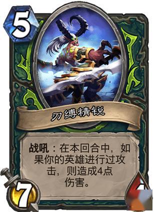 刃缚精锐 3分碾压火元素的存在。特别是配合手中的武器或者双刃斩击时,它在5费就可以拍下并触发特效。就算在6费配合英雄技能使用,刃缚精锐依然强大,7点攻击力可不是闹着玩的,更不用说还有4点直伤,解场走脸两相宜。任何注重进攻的恶魔猎手卡组都会认真考虑它的。