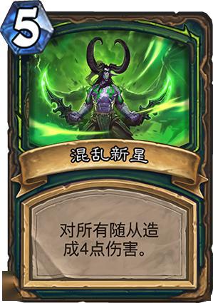 混乱新星 2分这个法术在其他许多职业的手里应该都会很厉害,但是在恶魔猎手这就显得有点尴尬。因为这种不分敌我的解场法术最适合的是被动型的控制卡组,但是恶魔猎手的其他卡牌看上去好像就跟控制没啥关系。不过无论如何,这卡还是很强,而且它的出现也让姐夫再次获得了史诗级强化。
