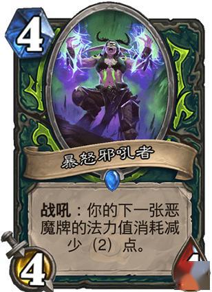 暴怒邪吼者 2分5费打出愤怒女祭司听上去好像很厉害,但是暴怒邪吼者想要有所发挥,恐怕还是必须要有一套携带大量高费恶魔的慢速卡组才行。这卡有点像当年的龙王配偶,虽然一开始被人吹上天,但结果根本就没人会带。总之,这张卡要想发光发热,很大程度上取决于是否有值得被减费的强力恶魔。而就目前来看,似乎还没有什么恶魔能够达到这样的强度。