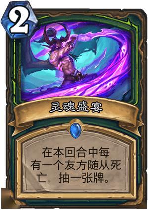 灵魂盛宴 1分也许你已经意识到了,我们对于杂毛铺场路线的恶魔猎手并不看好。灵魂盛宴必须要有某种特定的场面条件才能发挥作用,或者要配合协同打击或者统帅伊利达雷来共同使用,但这种组合技的启动未免也太慢了。恶魔猎手的过牌能力已经足够优秀,好像没有必要再来玩这种杂技。