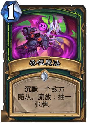 吞噬魔法 2分流放和沉默这两个效果并不算十分般配。因为你未必能够等到触发流放效果,而且沉默的应用又相对有限。不过这卡也不算是绝对不能用,毕竟1费过一牌的效果也算是不错了。所以如果有某种组合技恶魔猎手的话,单纯为了过牌也会愿意携带。