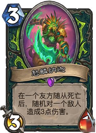 怒鳞纳迦 1分这卡不能被算作是一张真正意义上的3费随从。它完完全全就是一个组合技的零部件,用来配合超生体系,将场面转化为直伤。如果真的有这种杂毛铺场卡组的话,那么怒鳞纳迦也能够获得出场机会。但是讲真,我们对这种体系的恶魔猎手并不看好。而其他体系的恶魔猎手绝对不会带这个玩意,毕竟它只有1血。