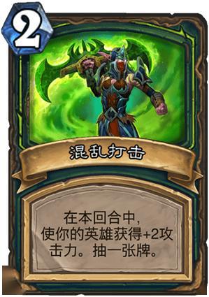 混乱打击 3分优质的低费解牌。单解卡一般都需要耗掉一张手牌,但是混乱打击可以再过一张牌,因此不仅能解场,而且还不亏卡。各种不同类型的恶魔猎手卡组应该都会愿意带上它。