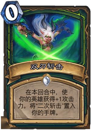 双刃斩击 4分简单粗暴,非常优质的解场手段。它的出现也提升了恶魔猎手各种武器和攻击力相关卡牌的价值。双刃斩击可谓是补刀利器,很多时候你可能就差这1-2点攻击力,因此它在对战的各个阶段都很好用。总之这张卡十分灵活,堪比盗贼手中的背刺。伊利丹一定会迫切希望这张卡能在明年加入基础卡。老实说双刃斩击不在基础卡之列多少让人觉得有些奇怪。