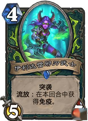 伊利达雷邪刃武士 1分这张卡的流放特效太难触发了,它自身的费用不低,而且需要打出的时机往往也不是你自己可以选择的。虽然乍看一下好像不错,但其实恶魔猎手的替代选择也不少,很可能根本就轮不到邪刃武士。流放体系的恶魔猎手需要更低的曲线,这卡费用太高,着实卡手。而慢速的恶魔猎手就更不会对它产生兴趣。