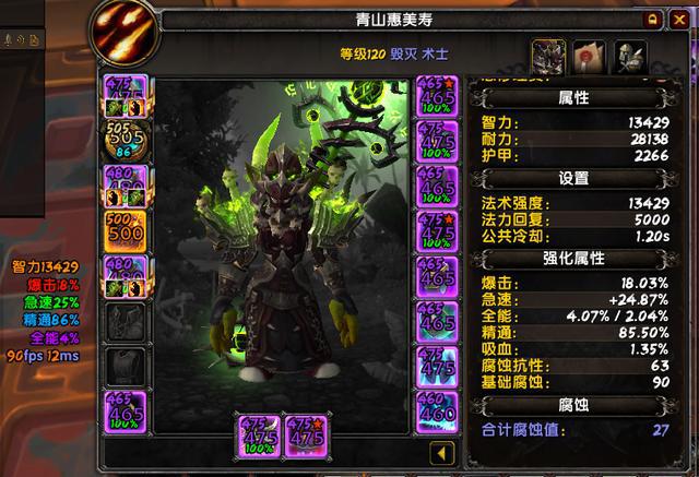 没有渠道急速,或者渠道急速有一两件又没办法达到那种爆炸的输出手感,那我推荐精通流派。特质推荐三闪点三粉碎最大化地狱火爆发,特质第三层放弃压倒选择鲜血虹吸增加精通,我现在场外面板暴击18急速25精通86,非扛旗图场内最大脑残箭30w+,腐蚀装选择两件三级触发急速,一件2级虚空仪式,饰品选择PVP主动使用增加智力和莱登白片。这种配装的思路就是让你急速满足燃烧10s CD,其他所有的属性都去堆精通,能堆多高就多高,毕竟精通是增伤第一属性。