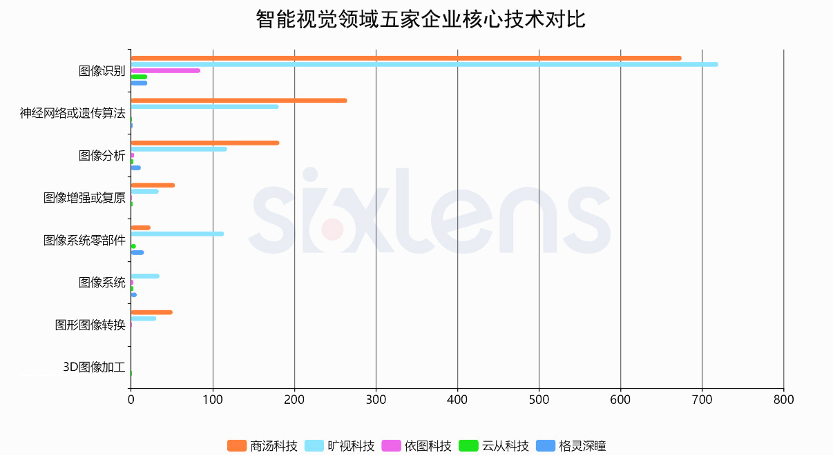 不过,六棱镜(sixlens)全球专利投融资情报统计,通过智能视觉领域五家企业核心技术对比看,涉及图像识别单项技术,旷视科技已经领先,商汤落于第二,而商汤的领先在于神经网络或遗传算法、图像分析、图像增强或复原、图形图像转换等方面技术成果丰富并领先较大,在图像系统、图像系统零部件领域技术积累却远远落后于旷视科技。