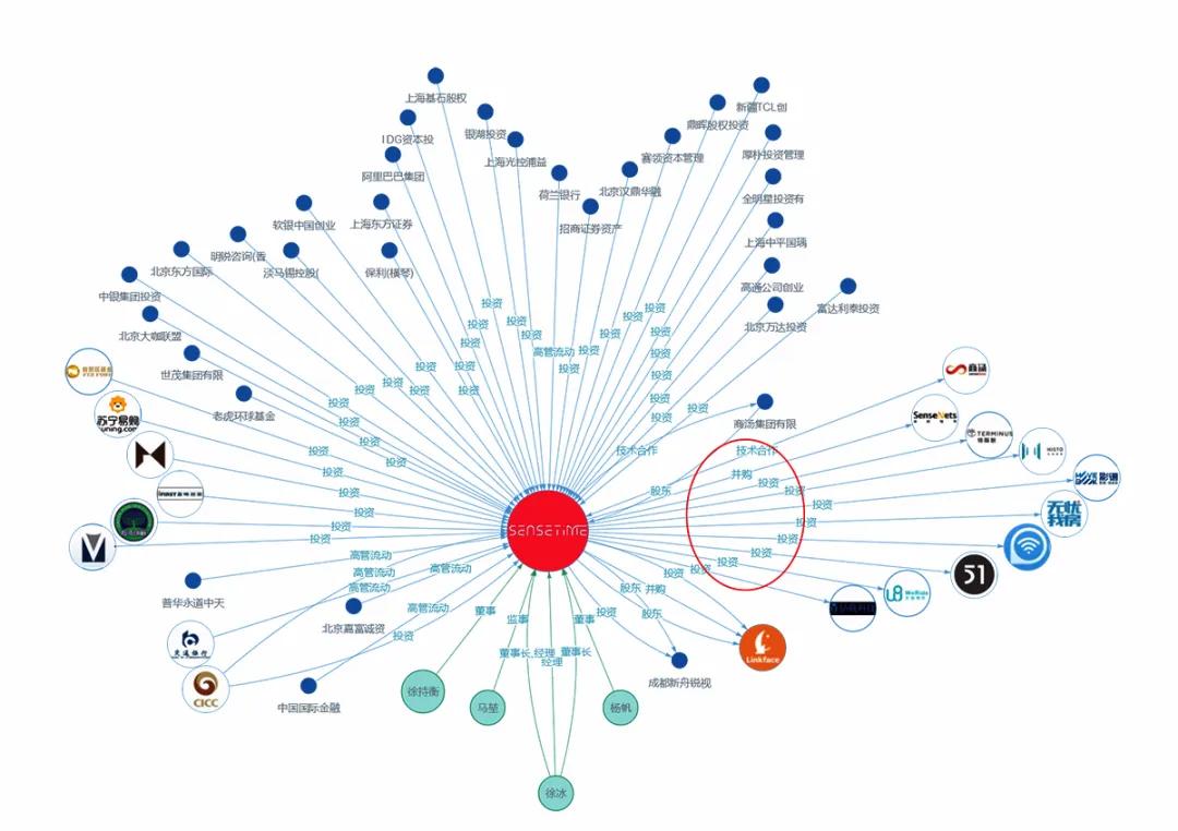 六棱镜投资关系图谱显示,商汤科技基于自身AI算法技术,向外投资了多个领域的公司,其中包括参与IDG资本投资、淡马锡控股、光速中国创业投资基金共同投资的,从钻石源头贸易到个人投资交易的实物金融平台——天津钻联科技有限公司;参与IDG资本投资、中信产业投资基金、中国光大控股投资的国内城市级智能物联网平台——重庆特斯联智慧科技股份有限公司;