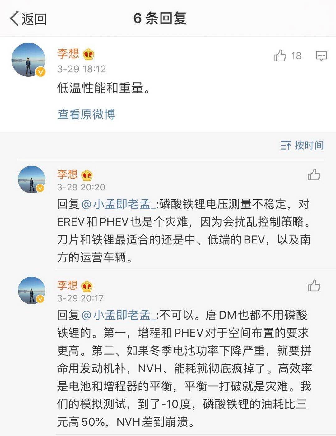 日前,比亚迪汽车销售公司副总经理李云飞通过微博,回复了李想关于刀片电池的顾虑。