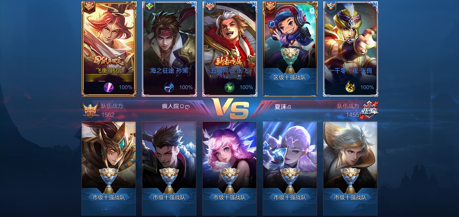 第二种情况就是像这样,大家都知道,最近王者里出来一个战队名次的东西,不知这种情况你遇到过吗?对面直接是一个战队的,五个都有标志,本身一个战队的人都非常有默契,更何况这是一个市级十强战队的组合。请问看到这种对手你慌不慌,迷不迷。