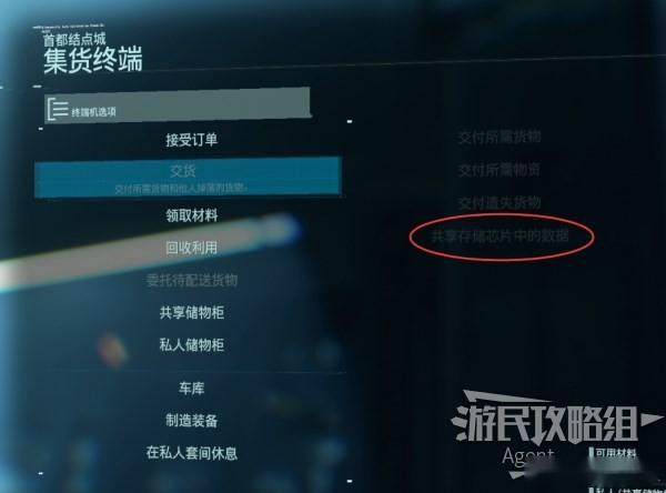 到终端机“交货”界面可解读出存储芯片的内容。然后在暂停游戏时的“数据”菜单可查看存储芯片的内容。
