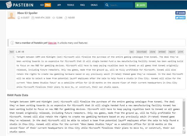 TechPlusGame引用了一份三月张贴到Pastebin的爆料,上书微软不仅仅将完成对《寂静岭》ip的相关交易,还会拿下《合金装备》和《恶魔城》。爆料中还列出了部分所谓的交易条款,包括了微软有义务为任何重制作品支付IP授权费,科乐美也保留了自己根据这些ip制作街机、赌博机的权益。而微软将会拥有任何新游戏、原创游戏的所有利润,并且将因此在日本成立一个新工作室。在这笔交易的前12-18个月,科乐美将会允许这个新的东京Xbox游戏工作室使用附属办公室,直到他们搬出去自立门户。