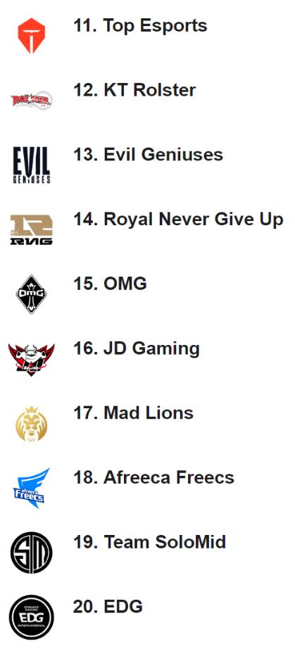 在这次排名中在年后拿到8连胜的FPX重新回到榜首并不意外,随着LCK赛区的回归,ES战队排名从上周的第四降到了第7,而随着上周IG被ES2-0碾压,IG这周的排名也降到了第8名。