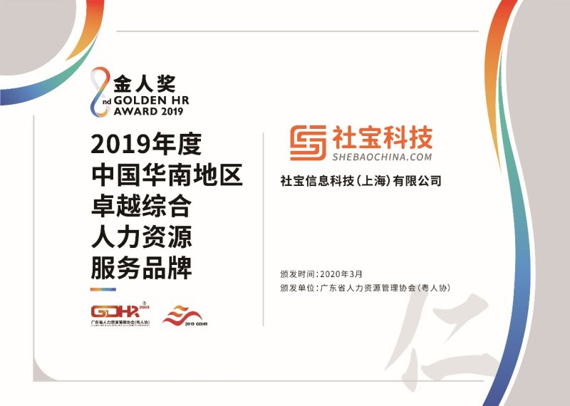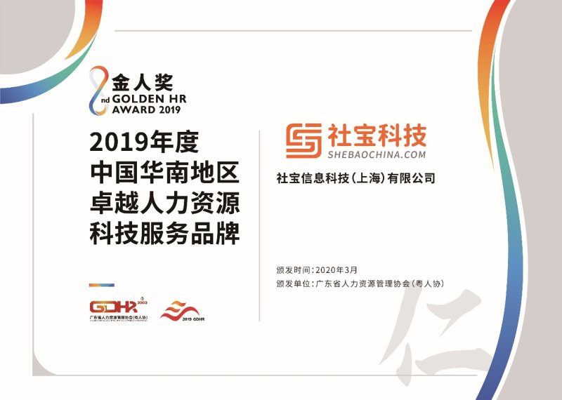 近日,由广东省人力资源管理协会(简称“粤人协”)举办的2019年度中国华南地区人力资源创先争优(金人奖)公益评选活动圆满结束。社宝科技从300多家参评企业中脱颖而出,一举拿下2019年度中国华南地区诚信人力资源服务品牌、2019年度中国华南地区卓越综合人力资源服务品牌、2019年度中国华南地区卓越人力资源科技服务品牌三项大奖,体现了极强的综合实力。