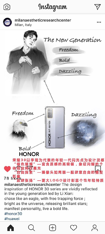 除了“一瞬倾心”的外表,此次荣耀手机的设计内核也让人赞叹不已。有网友曝光了一张疑似来自米兰美学研究所发出的荣耀新机设计灵感手稿,手机本身设计十分有新意,加上李现作为年轻一代的追求与生活态度,更体现出荣耀对年轻用户的洞察。